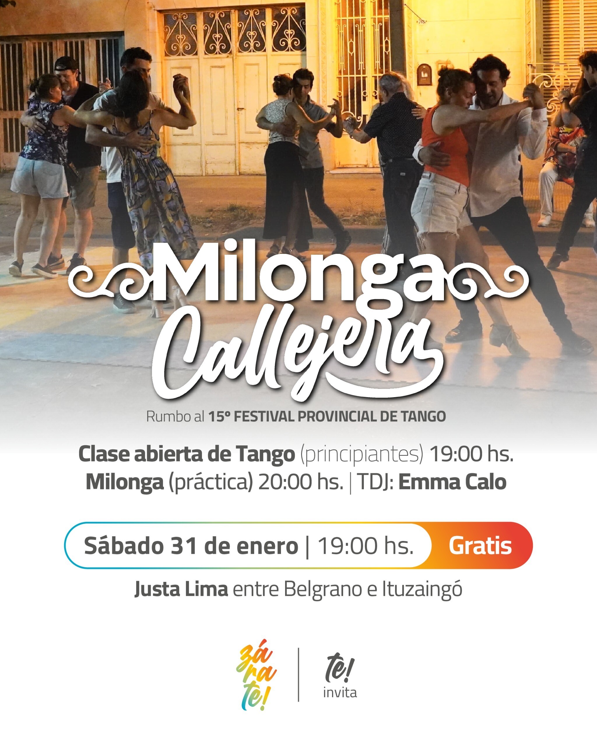 El sábado 31 de enero, a las 19 hs. en Justa Lima, entre Belgrano e Ituzaingó, se desarrollará “Milonga Callejera Rumbo al 15° Festival Provincial de Tango”. La actividad incluirá una clase abierta de tango a las 19 hs. y una milonga (práctica) a partir de las 20 hs. Además, el evento contará con la musicalización a cargo de la TDJ Emma Calo.