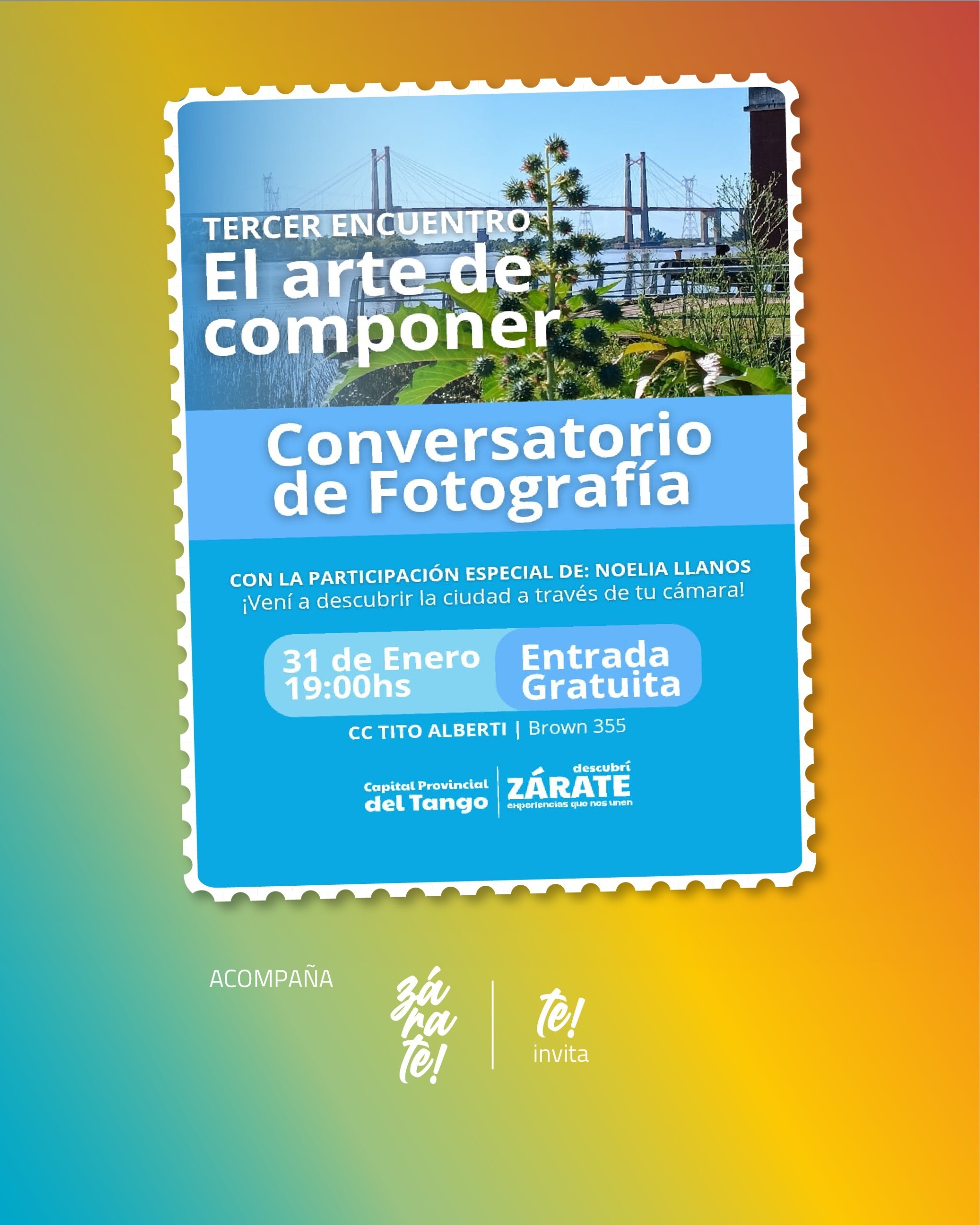 El sábado 31 de enero, a las 19 hs, en el CC Tito Alberti (Brown 355), se llevará a cabo el tercer encuentro “El arte de componer”, un conversatorio sobre fotografía. El evento contará con la participación especial de Noelia Llanos.