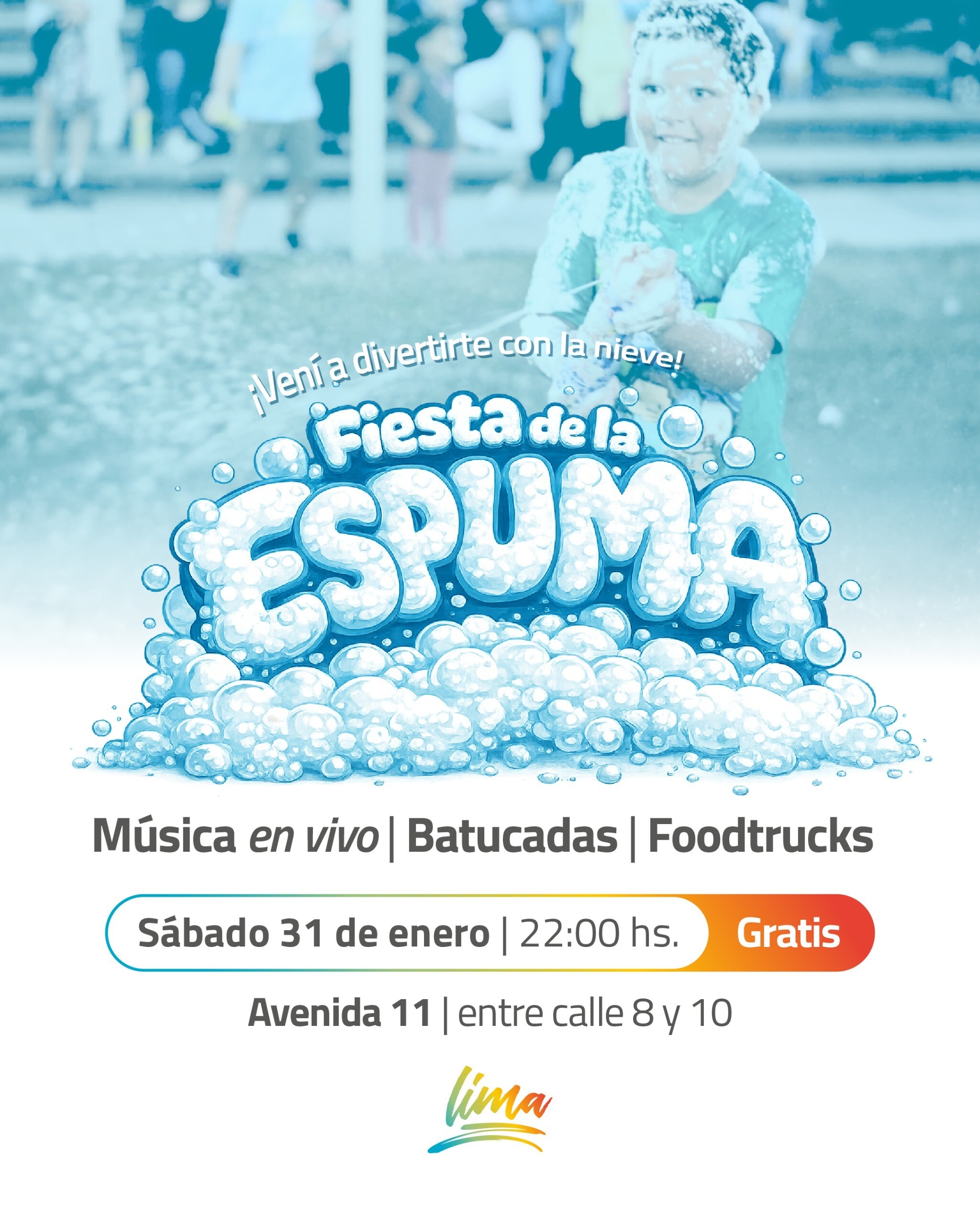 Este sábado 31 de enero, a las 22 hs, en Lima, sobre Avenida 11 entre Calle 8 y Calle 10, se llevará a cabo la Fiesta de la Espuma. Habrá música en vivo, batucadas y food trucks, para que los vecinos y vecinas puedan asistir con sus familias y amigos y disfrutar de una noche divertida.